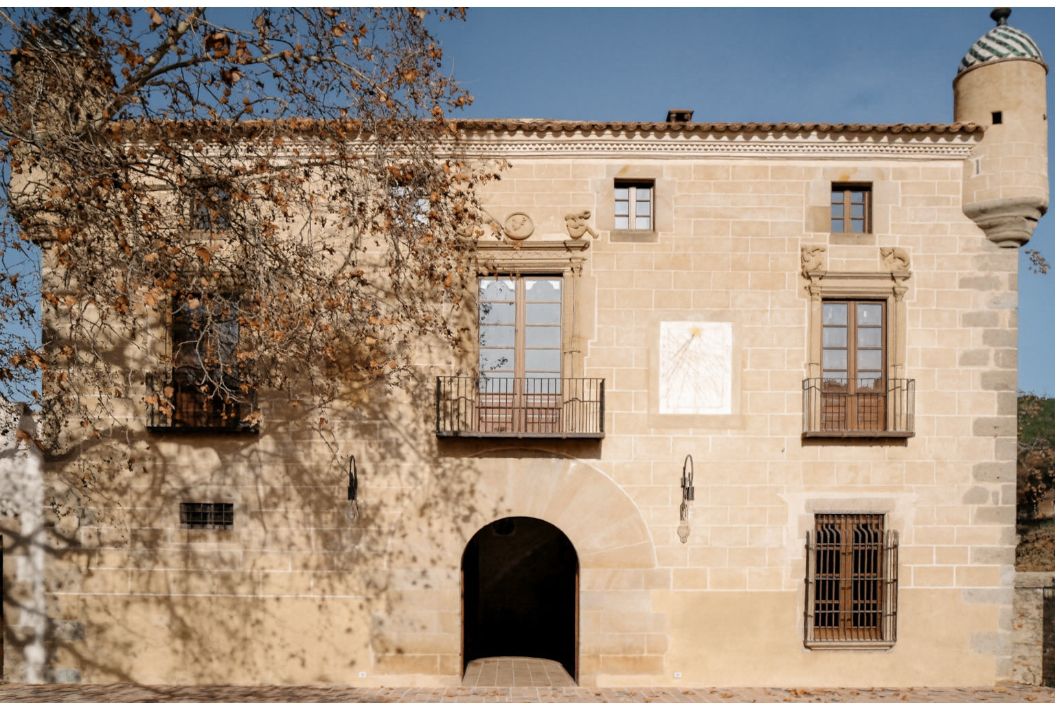 Su arquitectura refleja la elegancia del Renacimiento catalán, con muros de piedra que han resistido siglos, amplios ventanales que llenaban de luz las estancias y una composición simétrica propia del periodo. A ello se suman los cuatro torreones que la distinguen, incorporados por privilegio del rey Carlos I tras alojarse en la finca durante una cacería. Estos elementos no solo reforzaron su presencia arquitectónica, sino que también la convirtieron en un símbolo de prestigio y singularidad dentro del paisaje del Maresme.